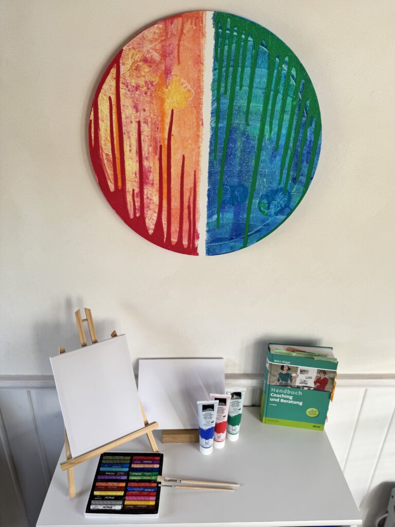 Als Kunstliebhaberin habe ich immer Leinwände, Pinsel, Ölkreide und Acrylfarbe zur Hand, damit du dich frei ausdrücken kannst.
